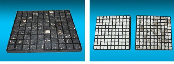 通過橡膠硫化技術,將馬賽克陶瓷鑲嵌在特種橡膠內,構成方形陶瓷橡膠復合體,在依靠焊接(三合一系列)或者高強度粘結劑黏貼(二合一)方式固定在設備的防護面上,形成堅固且有緩沖力的防磨層,較大的拓展了氧化鋁陶瓷的使用范圍。產品廣泛應用于火力發電廠的輸煤、排灰系統及冶金鋼鐵業的輸料、配料料倉、料斗等設備,有效的解決了因物料落差大,沖擊力強,導致配料輸送系統使用壽命低的問題;同時,陶瓷橡膠復合襯板能扭曲、劃割,適應于各種異型設備的安裝。